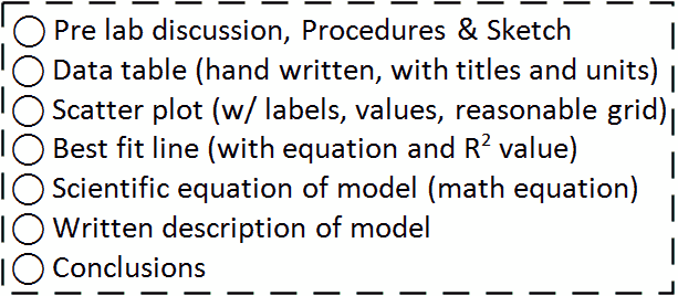 I use Modeling Instruction (this is an older site, AMTA will be launching an updated site in the next week or so) in my class, which focuses on analyzing data to develop models and reach conclusions. In most labs students plot data to look for trends, then develop the equation of the line/curve. As you can see above, my check list focuses on their data organization and plotting skills. Again, this frees me up to spend my time on their analysis and conclusions.
